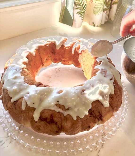 Roll out lightly on a floured wooden board to about an 18” circle and pour ½ cup of melted butter over dough. Sprinkle generously with sugar and cinnamon. Tuck one side of dough under and continue rolling dough into a log. Cut into 1 ½”-2” slices and place, touching, in extra large mold (as shown) or place in 9×12 baking pans or round cake pans with sides of rolls touching. Let rise 1 hour. Bake 350 degrees for 25 minutes or until golden brown on top. Spread icing while the rolls are warm. For a ring mold, cool enough to turn the rolls out onto a serving plate, and spread icing.